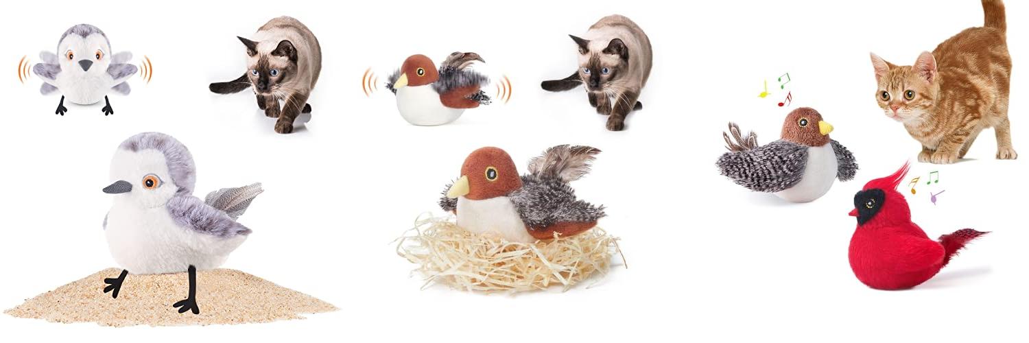 - The bird toys make chirping sounds. This gets your cat excited to play!