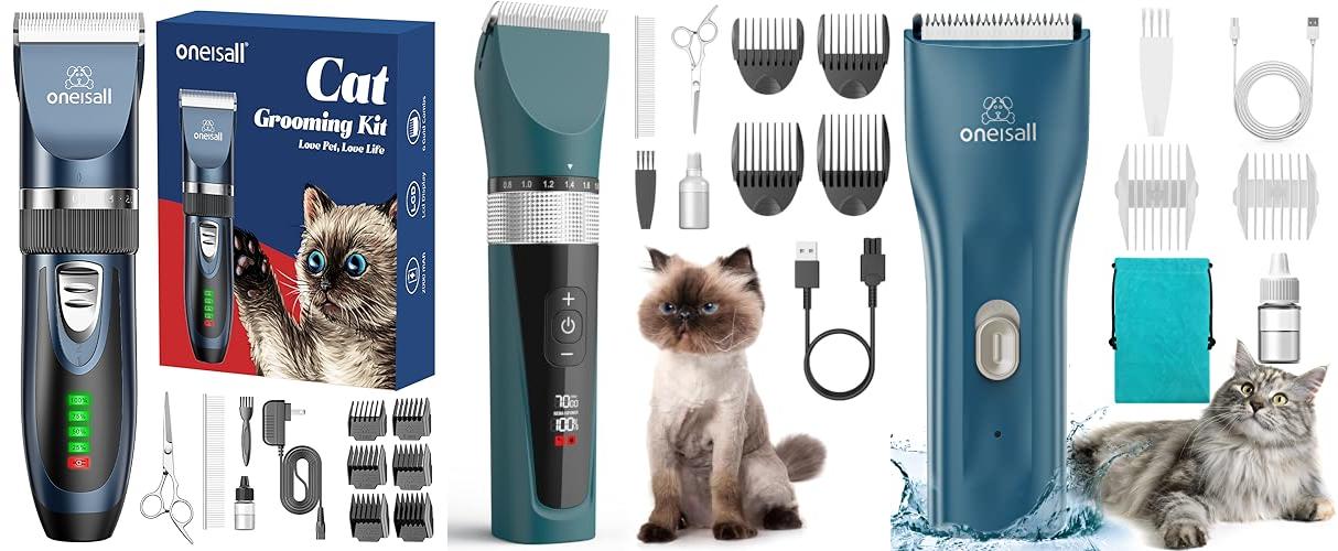 The oneisall Cat Clippers and Paw Trimmer is a 3-in-1 grooming kit. This kit helps you groom your cat at home. It includes clippers for the body, a trimmer for paws, and other useful tools. This kit is good for cats with long or matted hair. It is also suitable for small dogs.