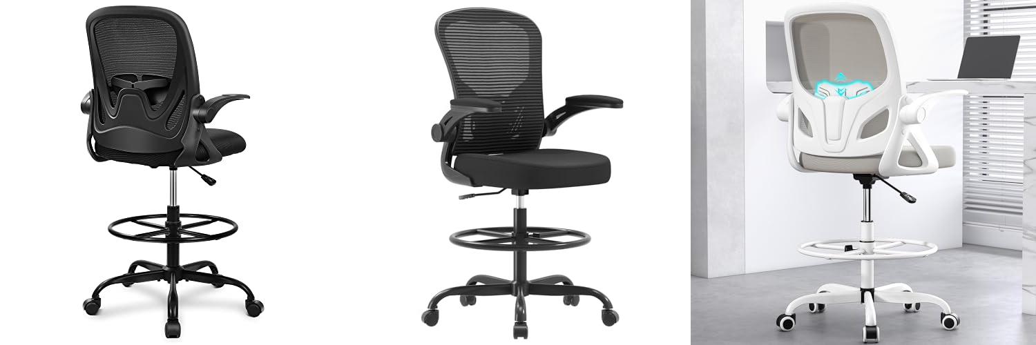 1. Primy Drafting Chair Tall Office Chair with Flip-up Armrests Executive Ergonomic Computer Standing Desk Chair with Lumbar Support and Adjustable Footrest Ring (Black)