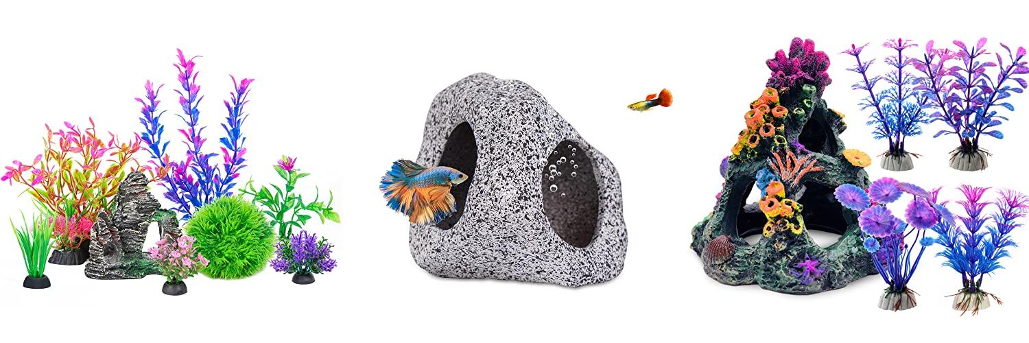 1. Ameliade Aquarium Artificial Plastic Plants Decorations and Rock Cave Decor Set Goldfish Betta Fish Tank Accessories Small Large Fish Bowl Ornaments