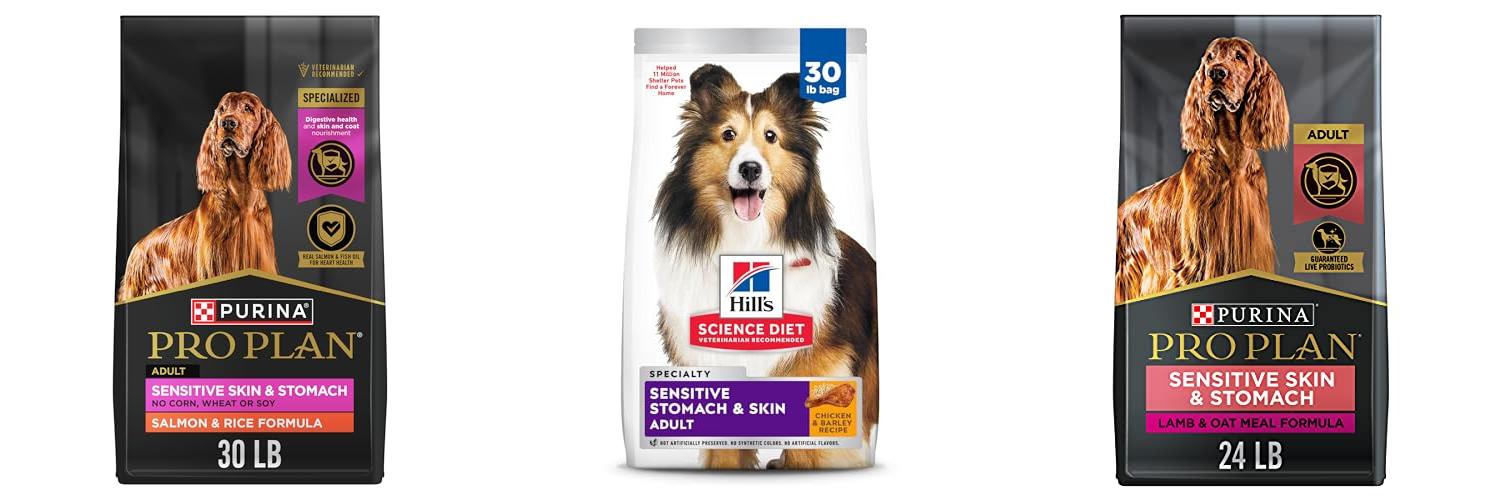 Purina Pro Plan Sensitive Skin and Sensitive Stomach Dog Food is a good option for dogs with tummy troubles and skin issues. This food offers important nutrients to help your dog feel better.