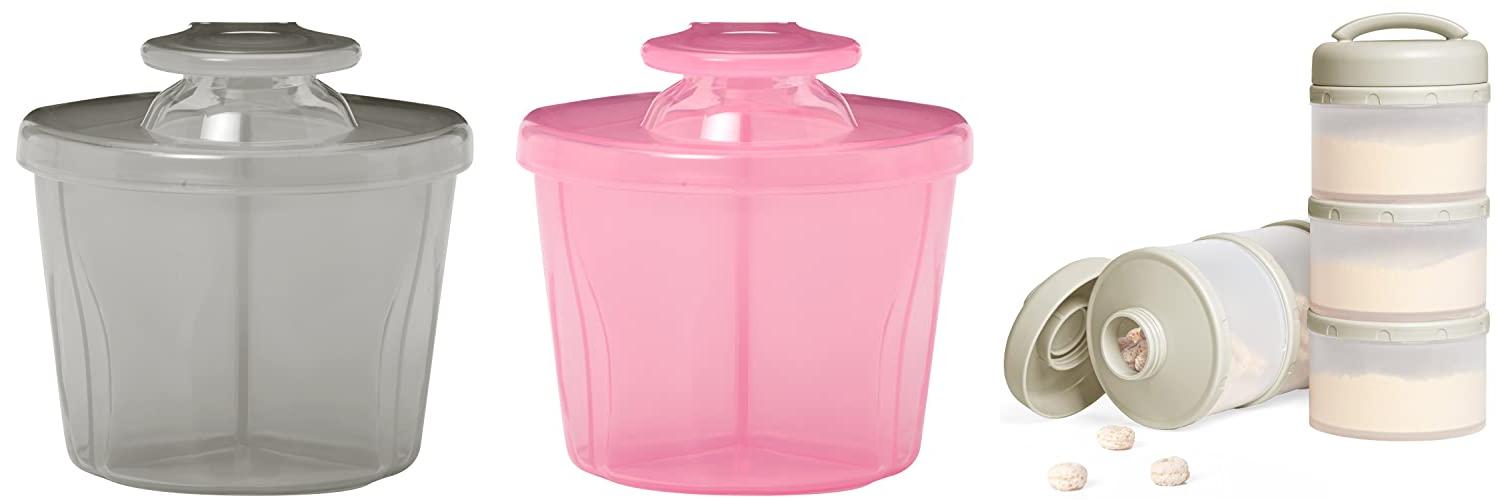 - The rotating lid with an easy-pour spout makes dispensing formula mess-free. Just twist the lid to line up with the compartment you need.