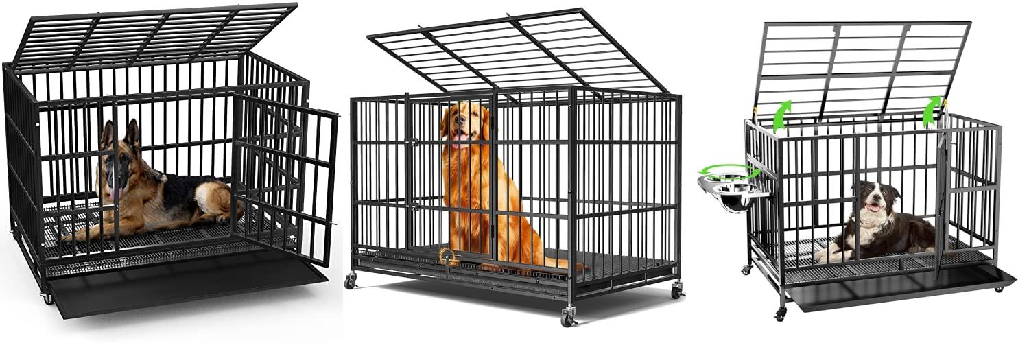 The LOVMOR 43″ Heavy Duty Dog Crate is built tough for your medium-sized dog. It has a smart design, including an air lift rod for easy opening and closing of the top door. The crate also features adjustable food bowls and is easy to clean. It is made with strong steel and has a slide-out tray for simple clean-up.