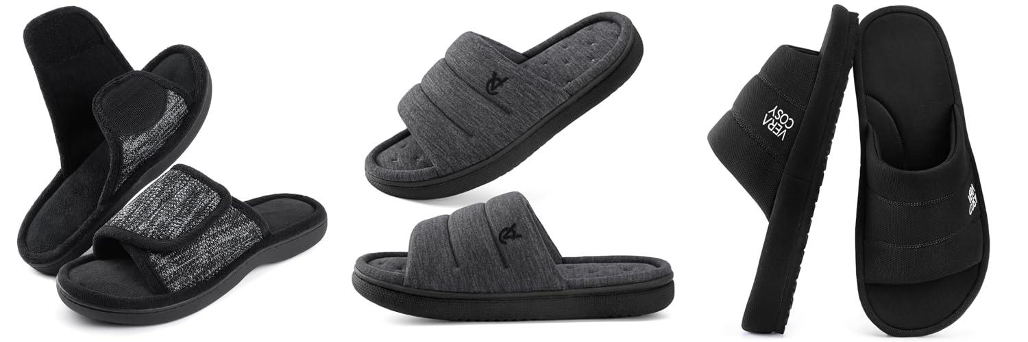2. VeraCosy Mens Open-Toe Slippers Memory Foam Indoor Outdoor House Shoes for Men Matt Black