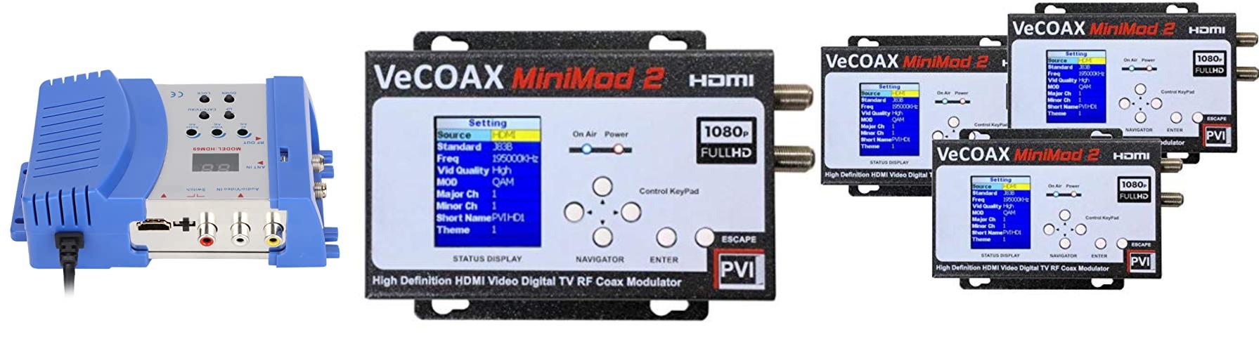 PVI ProVideoInstruments,3 PACK VECOAX MINIMOD-2 HDMI TO COAX MODULATOR to distribute your hdmi video sources to all TVs as HD Channels over existing tv coax cables